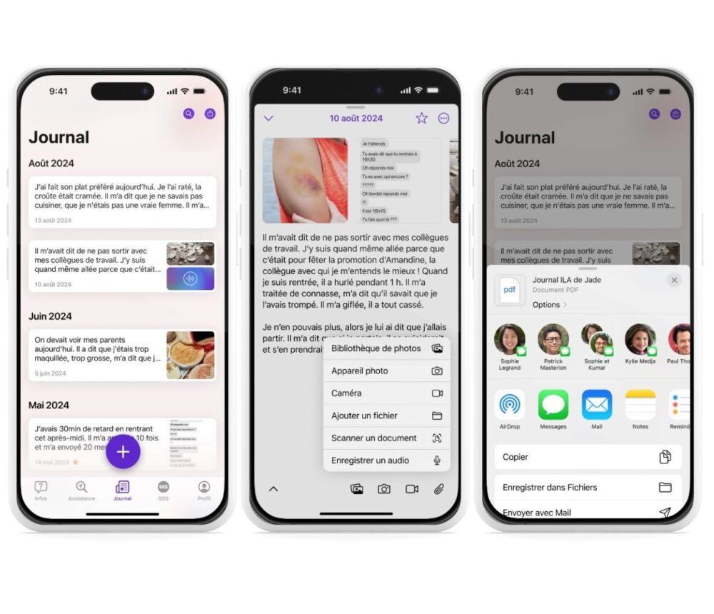 Le Journal pourra être exporté au format PDF avec l’intégralité des preuves qui y sont enregistrées, et transmis dans le cadre d’un dépôt de plainte, ainsi qu’aux professionnels intervenant.
